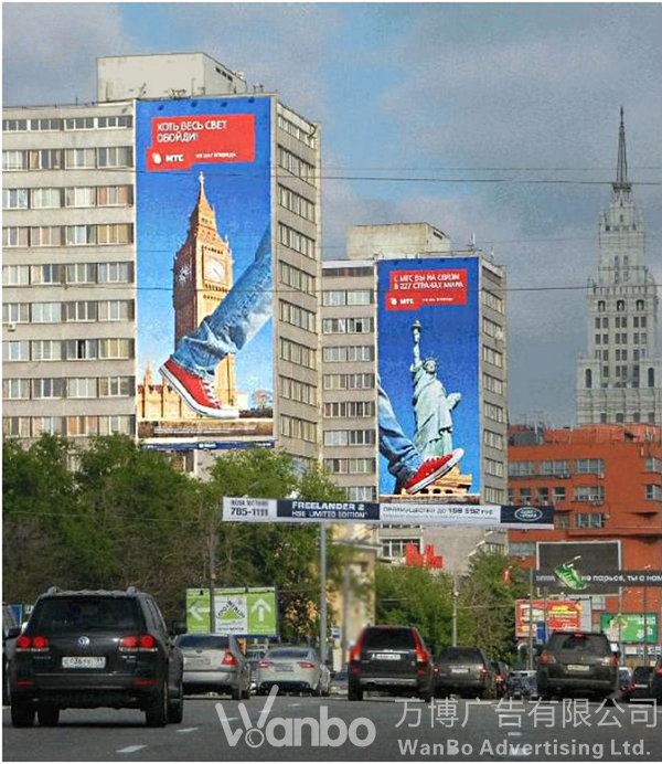 俄罗斯第一大移动运营商MTC,在闹市中的户外广告,为了诠释“足迹遍及全球!”的宣传语,从伦敦(前广告牌)到纽约(后广告牌)“一步之遥”的画面气势磅礴。