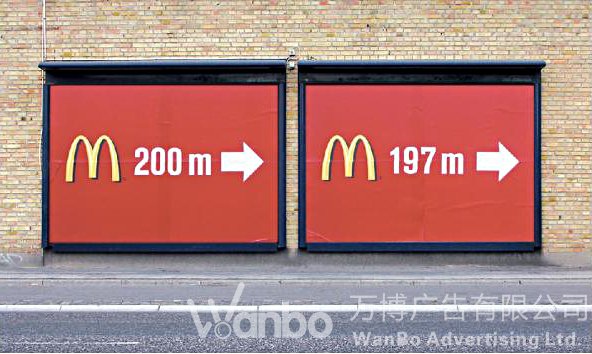 去这家麦当劳,方向距离都很明确。不仅如此,当你向前走过第一块牌后,右边第二块牌继而告诉你,离目的地距离减少了3m。如此精准的告示,更增加了广告的可信度——“相信我,不会错”。