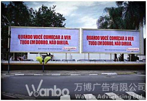 喝酒过量的人,视觉会产生错乱,同一物体会被看成双影。巴西SCHINCARIOL啤酒公司用双广告牌形式直接演示了这种双影视觉错乱效果:两块一模一样的广告牌,上面写着一模一样的字:“当你眼中呈现双影,别开车。”